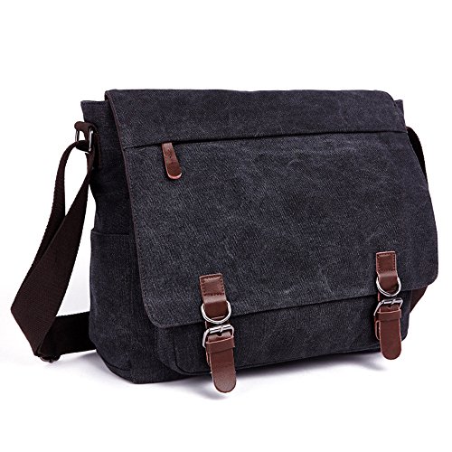 LOSMILE Laptop messengerväskor, axelväska för män, 40 cm vintage canvasväska för skola och arbete, flera fickor., Svart, X-Large