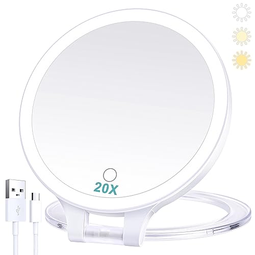 B Beauty Planet kosmetisk spegel med belysning 20 gånger, dubbelsidig 1 x /20 x kompakt spegel, med justerbart fällbart handtag, kosmetikspegel med förstoring, uppladdningsbar, 3 färglampor
