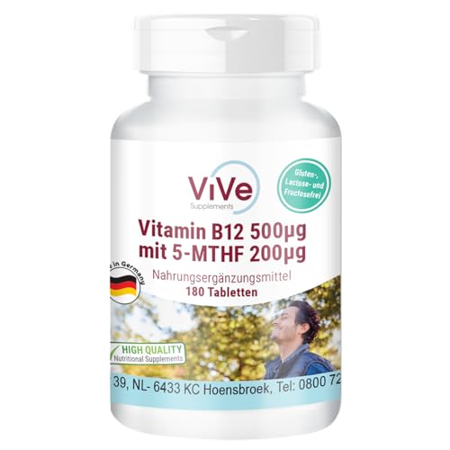 Vitamin B12 500μg 5-MTHF 200μg - 180 tabletter - metylkobalamin - aktiv folsyra - hög dos - biotillgänglig - kvalitet från Tyskland - ViVe Kosttillskott