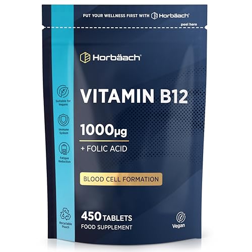 Vitamin B12 1000mcg med Folsyra | 450 Veganska Tabletter i 15 Månader | Kosttillskott Hög Dos | av Horbaach