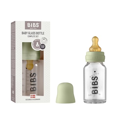 BIBS Baby Glass Bottle. Antikolik. Rund sugdel i naturgummilatex. Främjar naturlig amning, Complete Set - 110 ml, Sage
