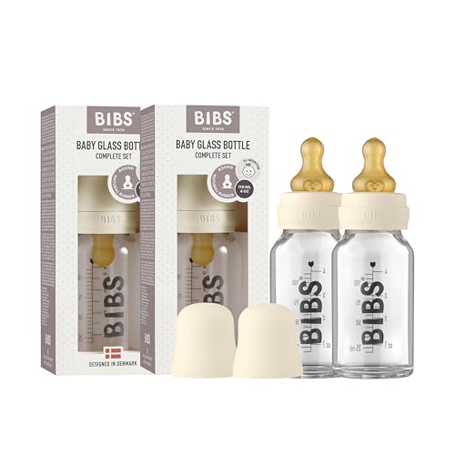 BIBS Baby Glasflaska 110 ml, 2-pack, minskar kolik, rund napp av naturgummiklatex, stöder amning, komplett set – 110 ml (förpackning med 2), elfenben