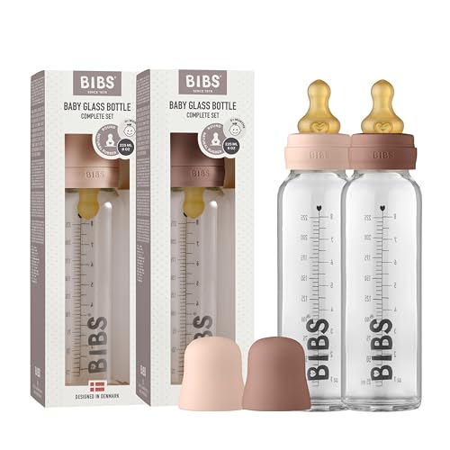 BIBS Baby Glass Bottle. 2-pack anti-kolik. Rund spets i naturgummi latex. Främjar naturlig amning, komplett set – 110 ml (förpackning med 2), Blush/Woodchuck