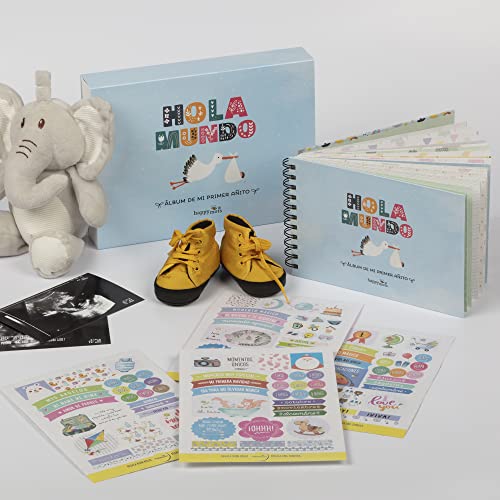 Album Bilder Baby Barn | HappyMots | 22cm x 15cm | Hej Världen | Levereras med Fodral | Baby Album för att klistra in foton och skriva | Dekorativa Klistermärken Set ingår