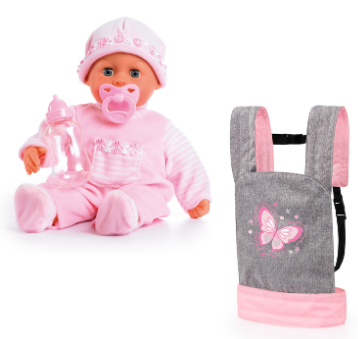 Bayer – Doll Carrier Grey & Pink + Doll First Words Baby Soft Pink 38 cm (Bundle)