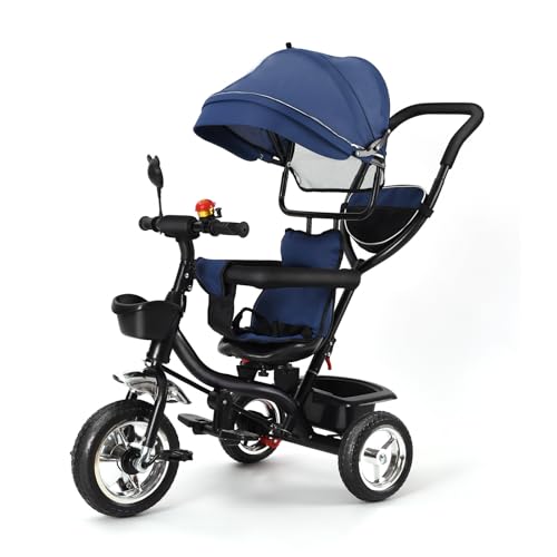 MUL-BOUTIQUE Trehjuling för baby, säker och bekväm babycykel med utvecklingsmöjligheter, stabil cykel för bebisar med ringklocka, speglar och solskydd (blå)
