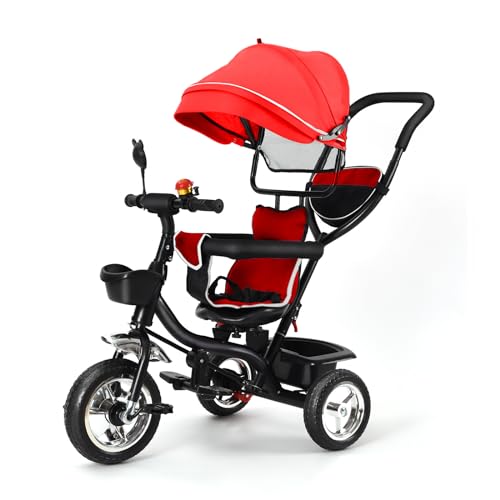 MUL-BOUTIQUE Trehjuling för baby, säker och bekväm babycykel med utvecklingsmöjligheter, stabil cykel för bebisar med ringklocka, speglar och solskydd (röd)