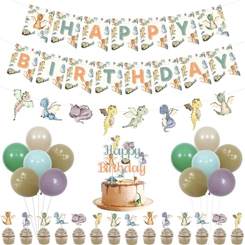 kreat4joy Drake födelsedagsfestdekorationer Dragon banderoll girlang tårta cupcake toppers ballonger magiska utskärningar för pojke flicka drake baby shower födelsedagsdekorationer