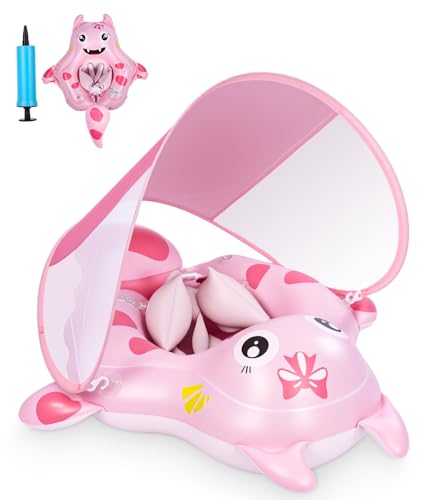 Dimweca Spädbarnspoolflottor med kapell,No Flip Over Baby Simning Float med markis och axelrem | Uppblåsbar Pool Float Säkerhetssits Simring för ålder 6-48 månader