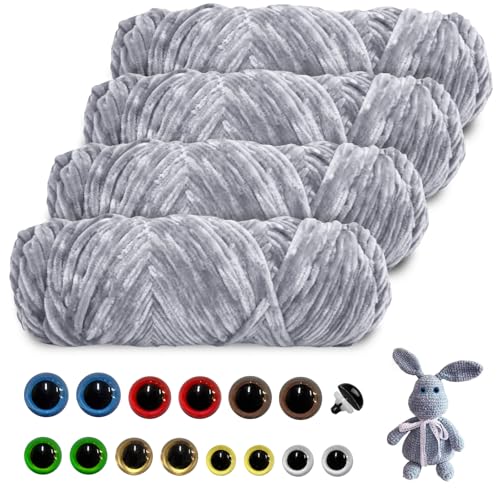 FIHODONE 400 g (4 × 100 g) chenille-ull för virkning, fluffig ull, stickning garn, baby-stickning mjuk med säkerhetsögon (grå)