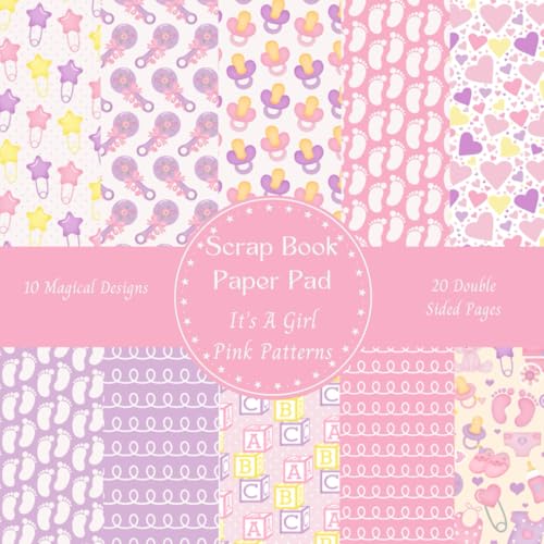 It's A Girl Pink Baby Scrapbook Paper Pad Decorative Patterned 8" x 8": Cardmaking Junk Journal Decoupage Aesthetic Mixed Media Art Collage 10 designs 20 double sided pages.