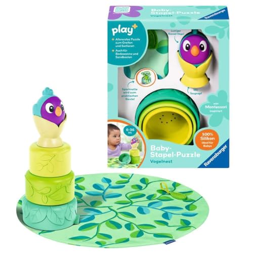 Ravensburger 4857 play+ Baby-Stapel-Puzzle: Vogelnest, Montessori-Puzzle, Silikon, Saugnapf-Spielzeug für Baby ab 6 Monaten