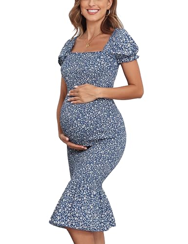 Maternity Summer Floral Midi Bodycon Dresses, Short Puff Sleeve Square Neck Ruffle Hem Mermaid Baby Shower Dress Blue XL
