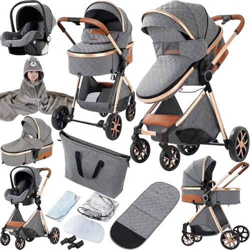 Prokoke Barnvagn 3-i-1, buggy med vändbar tvåvägs dragkraft, barnvagn ram aluminiumlegering, kombibarnvagn 3-i-1 vikbar baby småbarn nyfödda (225 grå)