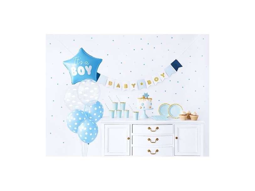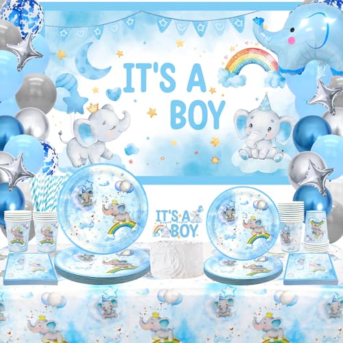 Elefant pojke baby shower tillbehör, inkluderar det är en pojkbakgrund, tallrikar, cupcake-dekorationer, servetter, koppar, bordsdukar, blå ballongbåge-kit, för baby shower födelsedagsfest