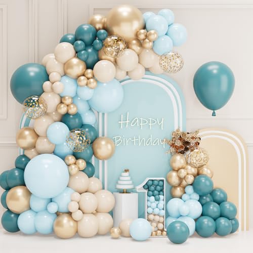 LUOBITO Dammig blå ballongbåge-kit, 125 st baby pastellblå ballonger girlang-kit, beige sandvita guldballonger för baby shower födelsedag bröllop examen jubileum festdekorationer
