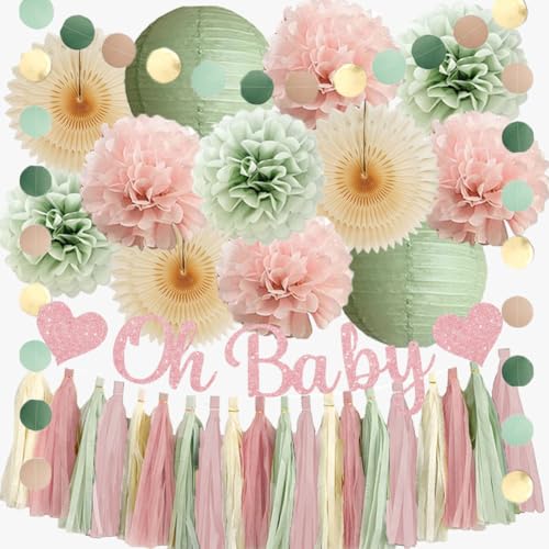 Salviagrön och rosa babyshower dekorationer Oh Baby salvia grön och dammig rosa baby shower dekorationer pastell beige fans kit med Oh Baby roséguld banderoll grädde rosa tofskransar för flicka