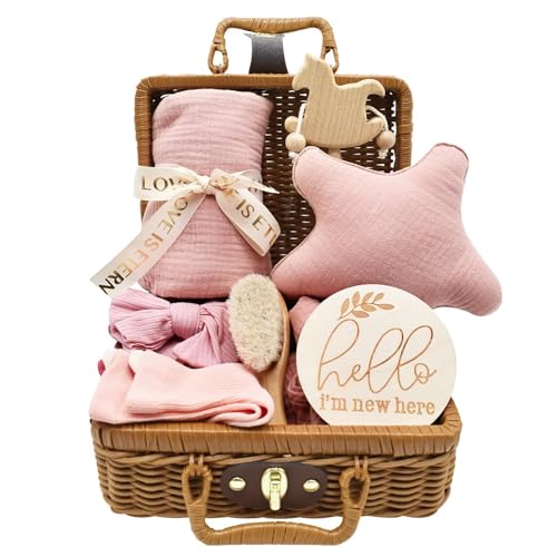 YTACREA 8-delad gåva för nyfödda, baby gåva pojke flicka, 8-i-1 baby presenter med filt, hästsael-leksak, babyhårband, babyborste, strumpor, milstolskort, souvenirlåda, rosa