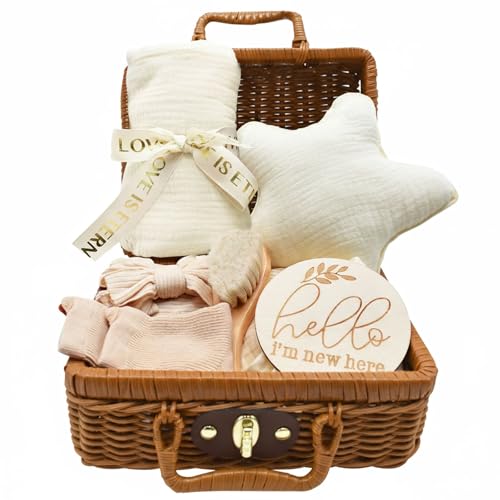 YTACREA 7-delad gåva för nyfödda, baby gåva pojke flicka, 7 n 1 baby presenter med filt, babyhårband, babyborste, strumpor, milstolskort, souvenirlåda, beige