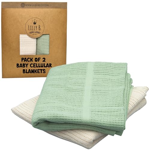 Lilly Belly- Cellular Blanket Baby | 100 % ren ekologisk bomull | Babyfilt - 70 x 90 cm | Varma och mysiga babyfiltar | Babyfilt för nyfödda | Perfekt för barnvagn/resor/Moses korgar (grön/elfenben)