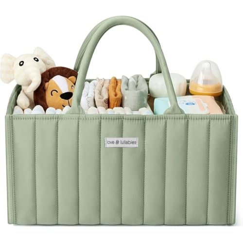 kärlek och vaggvisor blöjförvaring, snygg quiltad skötkorg för baby – nödvändigheter för nyfödda, babykorg för baby shower – caddie arrangör för blivande mamma (salvia grön)