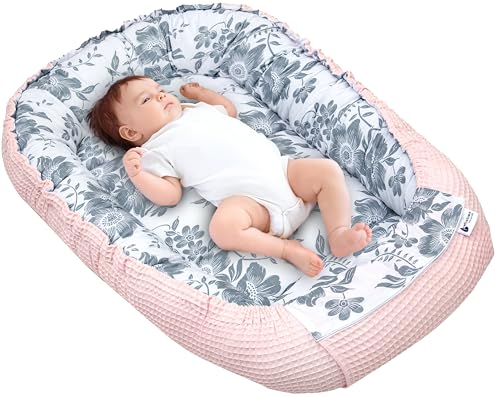 Medi Partners Babynest, gosig nest, babynest, 100% bomull, resesäng för spädbarn, 100 x 60 x 15 cm, avtagbar (Blommor med rosa Minky)