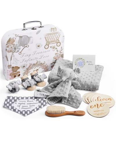 Lictin Baby presentset för pojkar flickor, 14 st babyshower gåvor, neutral nyfödd gåvakorg med babyfilt, trä månadsvis milstolpe-kort, elefant säkerhetsfilt (grå, 14 st)
