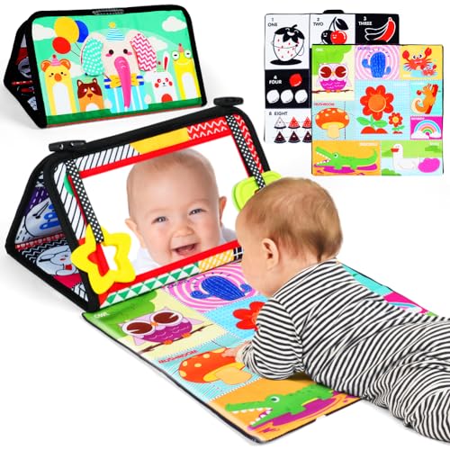 Aolso Babyspegel med knastrande bok, babyleksak för 0–9 månader, vikbar babyspegel, leksak för nyfödda, presenter till spädbarn – färgglad