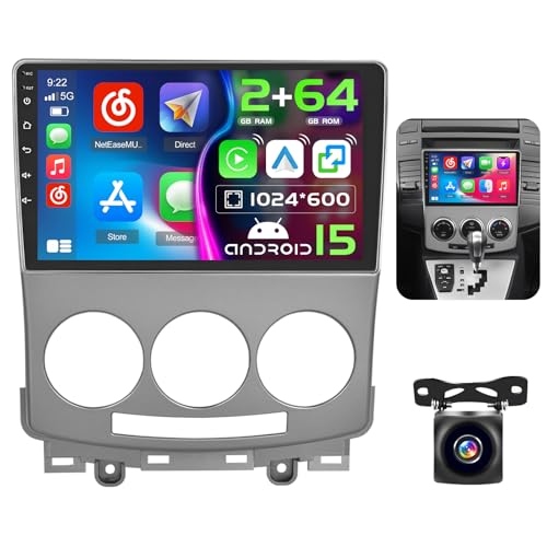 Hikity 2 GB+64 GB Android 15 bilradio för Mazda 5 2007 2008 2009 2010 med trådlös CarPlay Android Auto, 9 tums bilradio med navigeringsskärm Bluetooth FM RDS Radio SWC USB backkamera