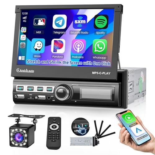 Hikity Bilradio 1 Din Carplay med 7-tums automatisk utdragbar pekskärm Bilradio Bilradio med Bluetooth Handsfree Mirror Link Android Auto USB FM AUX Backkamera