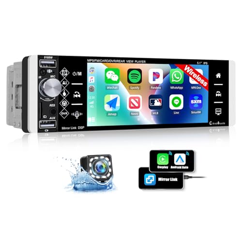 Rimoody Trådlös Apple Carplay 1 Din bilradio med Android Auto FM/AM/RDS Bluetooth-radio handsfree 5,1" bilradio med spegellänk Bluetooth USB/AUX/TF/EQ/DVR rattkontroller backkamera
