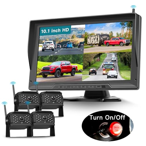Podofo 4 x Trådlös backkamera med IPS-skärm 10,1 tum, IP69 nattseende vidvinkel AHD för husbil/husvagn/lastbil, DC12V-36V, 1/2/3/4-delsskärm, loop-video, zooma in på bilden