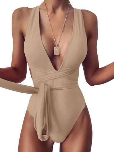 Lilosy sexig självslips-criss cross plunge backless high cut string one piece baddräkt för kvinnor öppen rygg vadderad cheeky bathing suit hög benbikini, kaki, M
