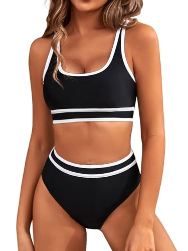 Bikini med hög midja för kvinnor magkontroll underdel push-up magtröja baddräkt 2 delar högt skurna tonåringar flickor baddräkter, Svart sport bikini, M