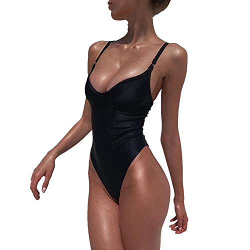 BKEPDY Dam baddräkt i ett stycke magkontroll badkläder V-ringad justerbara remmar vadderad baddräkt dam fladdermöss kostymer sexig rygg bodysuit för simning enfärgad halterbaddräkt, Svart L, XL (One