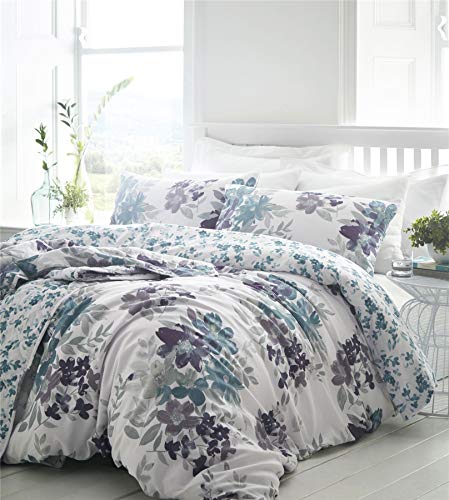 Kew Akvarell Blommig Täcke och Örngott Sänguppsättning Sängkläder Bäddset, Percale Bomull, Blå, Kung