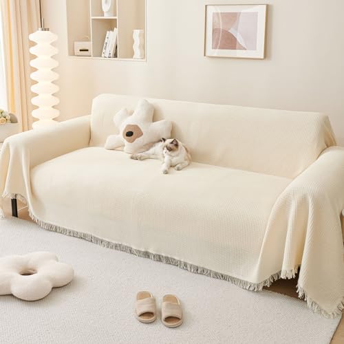 LHGOGO Våffelmönster överkast för soffor, stort 4 eller 3-sits sofföverkast med tofsar, mångsidigt vävt överkast för bäddsoffor och fåtöljer, 180 x 340 cm – gräddvit
