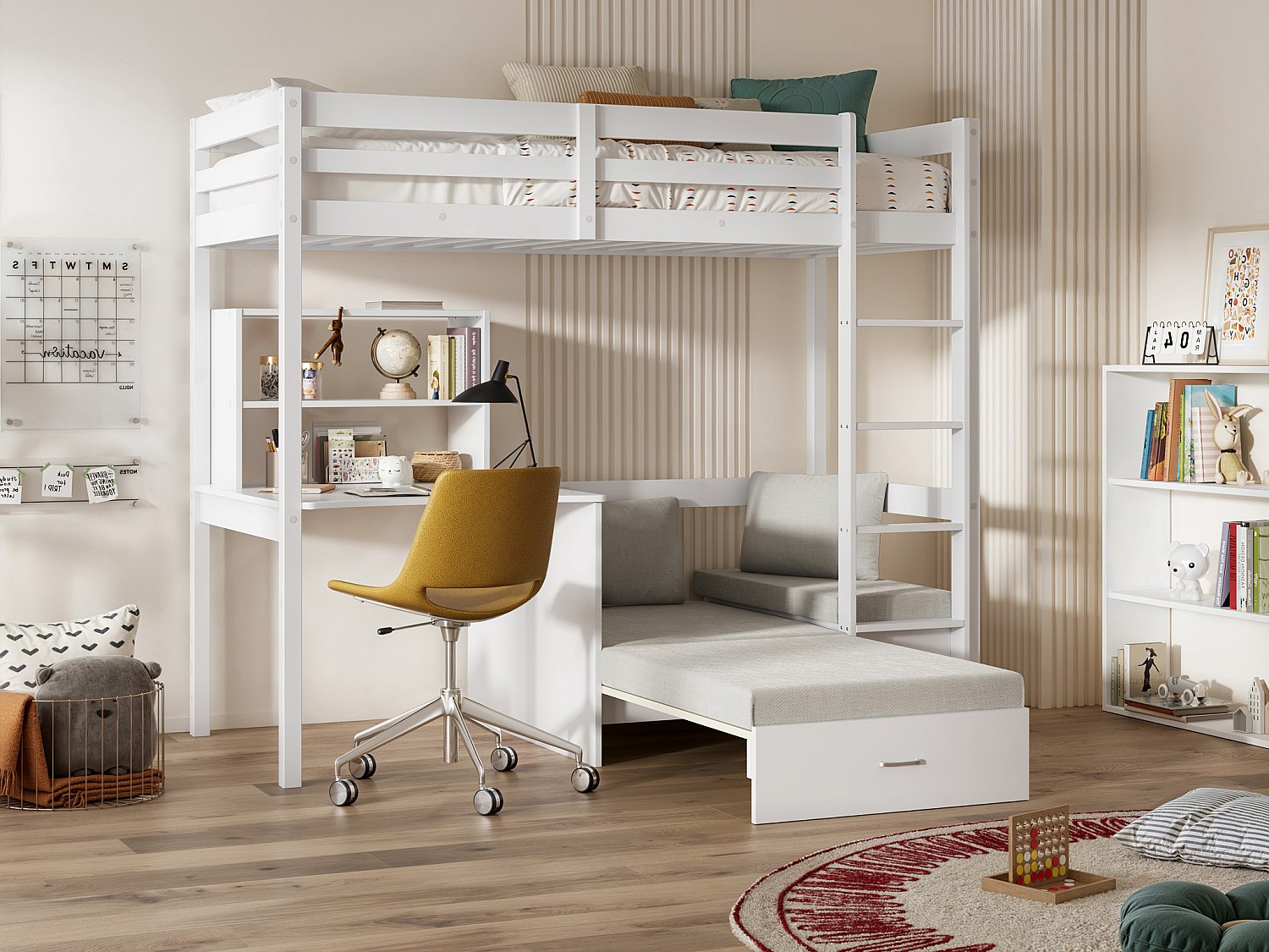 Loftsäng 90 × 200 i vit furu och MDF med skrivbord bäddsoffa och förvaring GOLIATH III