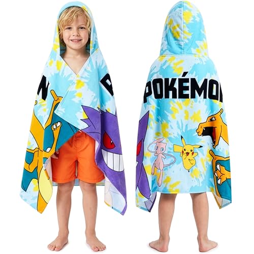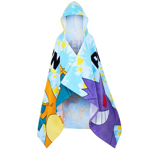 Pokemon badhandduk med huva för barn tonåringar anime ombytesrock absorberande bomullsponchohandduk för simning bad dusch strand semester nödvändigheter (blå, 6-14 år)