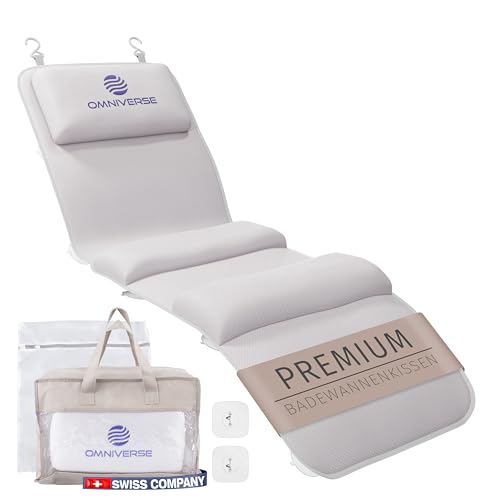 Omniverse Badkarskudde helkropp 125 × 40 cm för längd 160 – 180 cm, endast lämplig för släta badkar, snabbtorkande, hudvänlig, badkarsmatta med 3 integrerade kuddar, vit