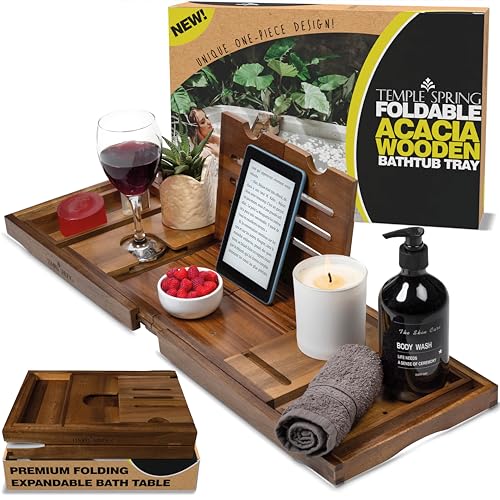 Temple Spring Fällbart Badkarsbricka i Akacieträ, Trähylla med Utdragbar Funktion, Hemspa-bräda för Vuxna, Badkarscaddy, Set med Badrumstillbehör i Trä – Ej Teak