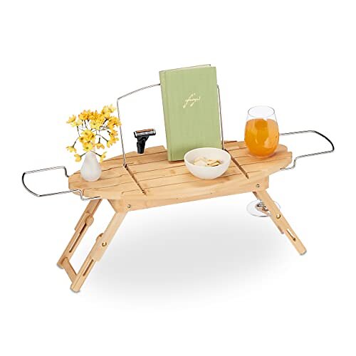 Relaxdays Badkarshylla, bambu, utdragbar 70–105 cm, vikbar, glashållare & bokstöd, badkarsbräda, natur