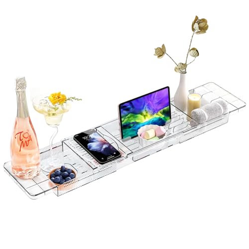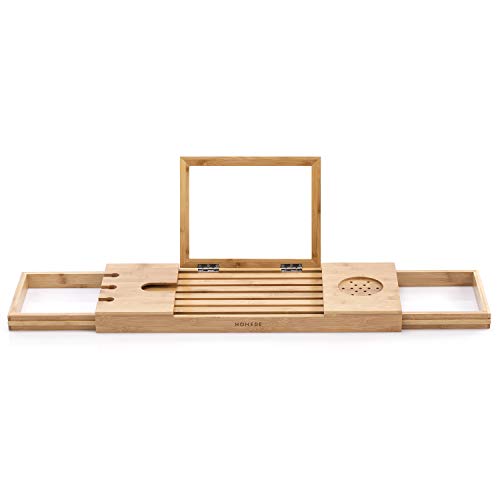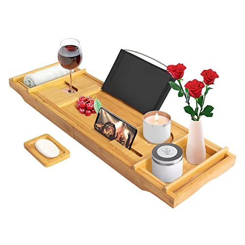 CHIMHOON Stor badkarshylla i trä, bambubricka, badkar caddy, laptop skrivbordshylla, badrumsmöbler, justerbar badkarsbräda, badkarshylla, för badkarstillbehör
