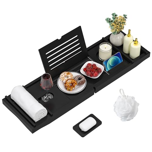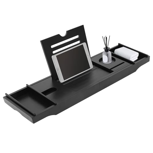 ZOFUN infällbar badrumsbricka, badkar caddy bricka badkar 55,5–78 cm, badkarshylla svart badkarsbricka hylla badkarsbräda för ljus tvål handdukar (556 x 179 x 52 mm)
