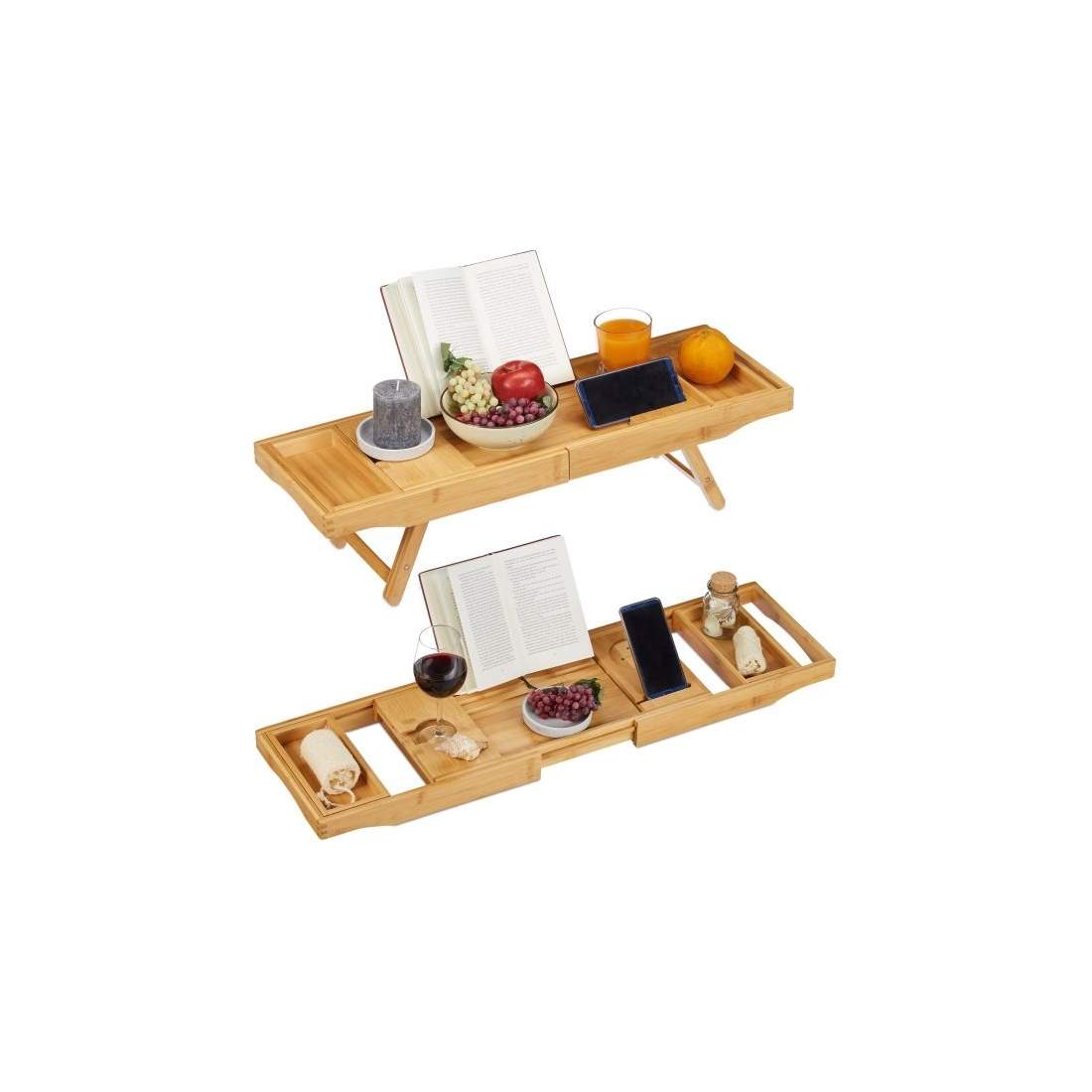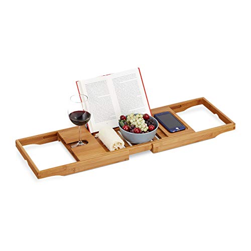 Relaxdays Bambu badkarshylla & bricka 2-i-1, bokstöd, vinhållare, badhylla, 74,5–114 cm utdragbar, natur, H x B x D: ca 18 x 114 x 25 cm