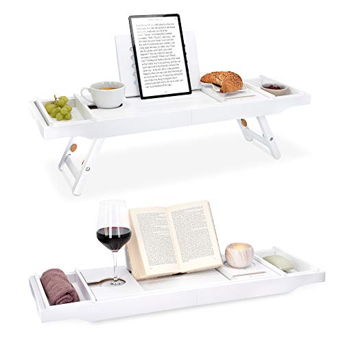 Navaris Bambu badkarshylla frukostbricka utdragbar – bokhylla vinglashållare – bricka för badkar och säng – av trä i vitt