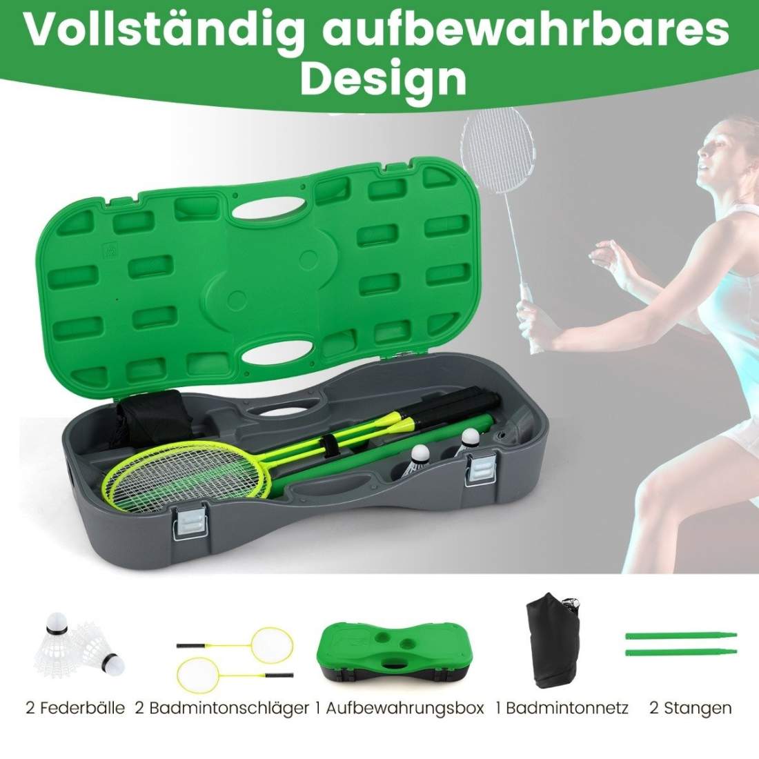 Badmintonset med 2 racketar, nät och förvaringslåda