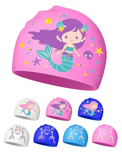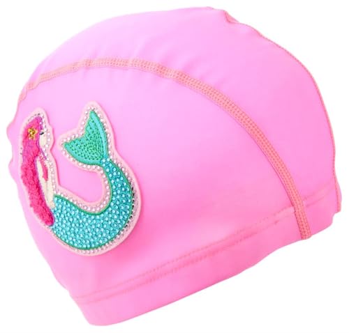 Badmössa barn i 4-12 år, vattentät silikon med söta mönster (rosa sjöjungfru)
