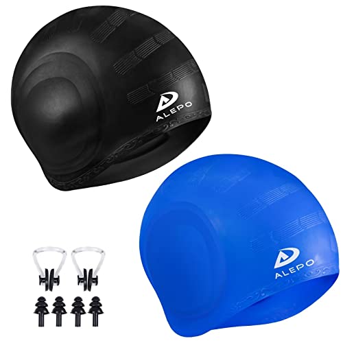Alepo 2-pack badmössa för barn, flickor, pojkar, badmössa, hållbar silikonbadmössa med 3D-öronskydd för småbarn, simmössa, långt hår i åldern 3–15 år, näsklämma svart blå