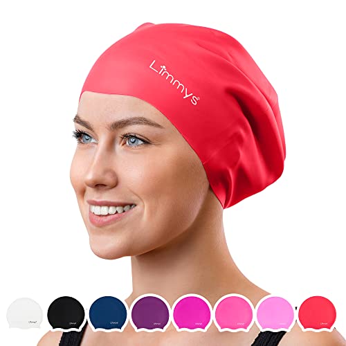 Limmys badmössa för vuxna med långt hår – 100% silikon badmössor för barn för män och kvinnor – premiumkvalitet, töjbara och bekväma badmössor – finns i olika attraktiva färger (L, röd)